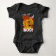 T-shirt facile pour déguisement Halloween ou fête de la récolte pour bébé. Idéal pour votre fête d'église ! Jolie famille de citrouilles debout près d'un arbre avec des feuilles d'automne orange sur un t-shirt. Lune et nuages blancs avec une famille de têtes de citrouille souriantes et amicales pour Halloween avec un BOO ! amical avec des yeux drôles sur chaque grande lettre ! Fond rayé graphique rouge et jaune ajouté. Ressemble un peu à un design de drapeau du soleil japonais