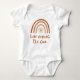 Ce pull à une pièce est muni d'une terre cuite bohème et d'un arc-en-ciel rouille avec un soleil au milieu et les mots "voici le soleil" écrit dans une police manuscrite boho. Ce pull est parfait pour annoncer un nouveau bébé dans la famille ou comme cadeau baby shower.