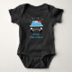 Ce produit personnalisé dispose d'une voiture de police noir et blanc avec des fenêtres bleues et d'un bar lumineux sur le toit avec des lumières rouges et bleues. Texte en bleu sous le croiseur de police pour le nom de votre enfant ou message personnalisé.
