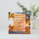 Une invitation colorée à la fête d'anniversaire d'automne dans un style bohème chic moderne avec du bois patiné dans différentes couleurs avec des feuilles d'automne et des baies rouges. Sur le dos est une image en bois foncé. Les feuilles d'automne rendent cette invitation non seulement appropriée pour un anniversaire saisonnier, mais peut également représenter la chute de la vie, et se référer à un anniversaire "au-dessus de la colline".