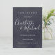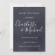 Doté de noms de style signature, ce tableau noir élégant enregistrer la carte de date peut être personnalisé avec vos informations spéciales de jour de mariage en lettrage blanc chic. Conçu par Thisisnotme©