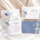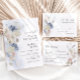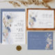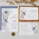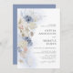 Boho Rustique Élégant Sur La Plage Bleu Dusty Simple Faire-part de mariage. Coquillages de bord de mer arrangés à la bohème invitation minimaliste avec boho élégant et simple bleu poussiéreux coquillages et coraux en aquarelle imprimée à la main. La couleur bleu arrière - plan est somptueuse pour les mariages boho et les mariages sur la plage. Invitations modifiables pour les mariages du printemps, de l'été, de l'automne et de l'hiver.