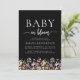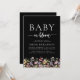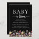Une belle bordure florale d'aquarelle fleur sauvage décore le bord inférieur de cette invitation à baby shower boho tendance. Les mots "Baby in florom" apparaissent dans les polices serif et script, avec des swashes avant et après le script. Personnalisez le texte avec le nom de la future maman et les détails de la douche en blanc sur un arrière - plan noir. Le dos de la carte est noir.