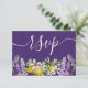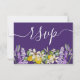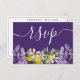 Carte RSVP rustique et boho avec calligraphie de style à grande main en blanc sur un arrière - plan violet. Avec également de magnifiques citrons et lavande peints en aquarelle. OEuvre originale du studio créée pour votre journée spéciale. Texte entièrement modifiable pour que vous puissiez facilement supprimer ou modifier/ajouter des mots qui correspondent à vos plans mariages.