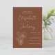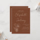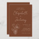 Cette faire-part de mariage moderne présente un texte couleur crème sur un arrière - plan en terre cuite marron foncé. Une ligne de conception florale apparaît dans le coin inférieur gauche. Ajoutez les noms de la mariée et du marié dans un script design d'écriture crème et les détails dans la police sans serif.