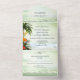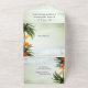 Boho élégant tout en une faire-part de mariage larvée avec un design tropical côtier avec palmiers, lanternes festives et fleurs colorées donnant sur une plage pétillante et vert pâle