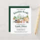 Une invitation à baby shower pour les couples rustiques et économiques avec une jolie aquarelle illustrant les animaux des bois campant avec leur tente et leur feu de camp dans les montagnes et la forêt et "Notre plus grande aventure attend" et les noms de la mère et du père dans un script vert foncé et une typographie élégante.