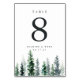 Les cartes de numéro chic Wintry woodland comprennent un regroupement de pins aquarelles en vert chasseur et vert sauge. Personnalisez avec chaque numéro de table, avec vos noms et la date mariage en dessous. Le design se répète à l'envers. Coordonné avec notre suite de faire-part de mariage de Timber Grove.