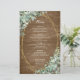 Les options de menu mariage sont encadrées de bouquets de verdure d'eucalyptus sur un cadre géométrique doré. L'arrière est orné d'un arrière - plan en bois rustique.