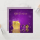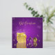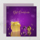 Illustration de Noël magique et glamour : boîte cadeau dorée scintillante à côté d'un or et de boules de sapin de Noël violettes et de perles dorées sur un fond bokeh violet élégant.