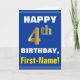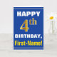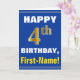 Ce simple design de carte de voeux sur le thème de l'anniversaire présente un voeu d'anniversaire chaleureux comme "HEUREUX 4ème anniversaire, prénom!" sur le devant, en texte gras sur un arrière - plan de couleur bleue. Le numéro d'anniversaire a un look de couleur imitation or. Le nom sur le devant peut être personnalisé. L'intérieur comporte un message d'anniversaire qui peut être customisé. Une carte de voeux comme celle-ci pourrait être une façon amusante de transmettre des voeux d'anniversaire à quelqu'un qui célèbre son quatrième anniversaire. [~Z0000278]