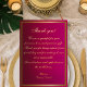 Faites une déclaration de gratitude audacieuse avec ce carte de remerciements rose et or fuchsia, avec d'élégantes calligraphies or et un cadre en or double sur un arrière - plan magenta riche et dynamique. Ce design glamour est parfait pour les mariages, les douches nuptiales, ou toute célébration remplie de couleur et de joie. Message de remerciement préécrit inclus, ou personnalisez le vôtre. Idéal pour des thèmes mariages modernes, audacieux ou luxueux.
