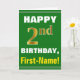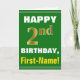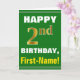 Ce simple design de carte de voeux sur le thème de l'anniversaire présente un voeu d'anniversaire chaleureux comme "HAPPY 2nd BIRTHDAY, First-Name!" sur le devant, en texte gras sur un arrière - plan de couleur verte. Le numéro d'anniversaire a un look de couleur imitation or. Le nom sur le devant peut être customisé. L'intérieur comporte un message d'anniversaire qui peut être customisé. Une carte de voeux comme celle-ci pourrait être une façon amusante de transmettre des voeux d'anniversaire à quelqu'un qui célèbre son deuxième anniversaire. [~Z0000279]
