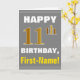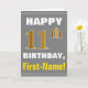 Ce simple design de carte de voeux sur le thème de l'anniversaire présente un voeu d'anniversaire chaleureux comme "HAPPY 11th BIRTHDAY, First-Name!" sur le devant, en texte gras sur un arrière - plan gris (gris). Le numéro d'anniversaire a une apparence de coloration fausse/imitation or. Le nom sur le devant peut être customisé. L'intérieur comporte un message d'anniversaire personnalisable. Une carte de voeux comme celle-ci pourrait être une façon amusante d'offrir des voeux d'anniversaire à quelqu'un qui célèbre son onzième anniversaire. [~Z0000283]
