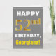 Cette simple carte de voeux d'anniversaire présente un souhait d'anniversaire chaleureux comme "HAPPY 52nd BIRTHDAY, Georgiana !" sur le devant, en texte gras sur un arrière - plan gris (gris). Le numéro d'anniversaire a une apparence de coloration fausse/imitation or. Le nom sur le devant peut être customisé. L'intérieur comporte un message d'anniversaire qui peut être personnalisé. Une carte de voeux comme celle-ci pourrait être une façon amusante d'offrir des voeux d'anniversaire à quelqu'un qui célèbre son cinquante-deuxième anniversaire. [~Z0000283]