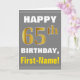 Ce simple design de carte de voeux sur le thème de l'anniversaire présente un voeu d'anniversaire chaleureux comme "HAPPY 65th BIRTHDAY, First-Name!" sur le devant, en texte gras sur un arrière - plan gris (gris) coloré. Le numéro d'anniversaire a une apparence de coloration fausse/imitation or. Le nom sur le devant peut être customisé. L'intérieur comporte un message d'anniversaire qui peut être customisé. Une carte de voeux comme celle-ci pourrait être une façon amusante d'offrir des voeux d'anniversaire à quelqu'un qui célèbre son soixante-cinquième anniversaire. [~Z0000283]