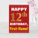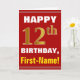Ce simple design de carte de voeux sur le thème de l'anniversaire présente un voeu d'anniversaire chaleureux comme "HAPPY 12th BIRTHDAY, First-Name!" sur le devant, en texte gras sur un arrière - plan de couleur rouge. Le numéro d'anniversaire a un look de couleur imitation or. Le nom sur le devant peut être customisé. L'intérieur comporte un message d'anniversaire qui peut être customisé. Une carte de voeux comme celle-ci pourrait être une façon amusante d'offrir des voeux d'anniversaire à quelqu'un qui célèbre son douzième anniversaire. [~Z0000276]