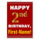 Cette simple carte de voeux d'anniversaire présente un souhait d'anniversaire chaleureux comme "HAPPY 2nd BIRTHDAY, First-Name !" sur le devant, en gras sur un arrière - plan de couleur rouge. Le numéro d'anniversaire a un look de couleur imitation or. Le nom sur le devant peut être personnalisé. L'intérieur comporte un message d'anniversaire personnalisable. Une carte de voeux comme celle-ci pourrait être une façon amusante de transmettre des voeux d'anniversaire à quelqu'un qui célèbre son deuxième anniversaire. [~Z0000276]