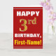 Ce simple design de carte de voeux sur le thème de l'anniversaire présente un voeu d'anniversaire chaleureux comme "HEUREUX 3ème anniversaire, prénom!" sur le devant, en texte gras sur un arrière - plan de couleur rouge. Le numéro d'anniversaire a un look de couleur imitation or. Le nom sur le devant peut être customisé. L'intérieur comporte un message d'anniversaire personnalisable. Une carte de voeux comme celle-ci pourrait être une façon amusante d'offrir des voeux d'anniversaire à quelqu'un qui célèbre son troisième anniversaire. [~Z0000276]