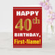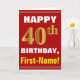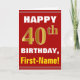 Ce simple design de carte de voeux sur le thème de l'anniversaire présente un voeu d'anniversaire chaleureux comme "HAPPY 40th BIRTHDAY, First-Name!" sur le devant, en texte gras sur un arrière - plan de couleur rouge. Le numéro d'anniversaire a une apparence de coloration fausse/imitation or. Le nom sur le devant peut être personnalisé. L'intérieur comporte un message d'anniversaire personnalisable. Une carte de voeux comme celle-ci pourrait être une façon amusante d'offrir des voeux d'anniversaire à quelqu'un qui célèbre son quarantième anniversaire. [~Z0000276]