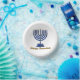 Joyeux texte en or de Chanoukah avec une menorah bleue sur le devant et dreidel sur le dos. Le texte pour qui il est à et de est à l'arrière.