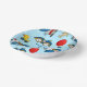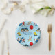 Boules en papier anniversaire de enfant amusantes et colorées avec un motif de jouets pour enfants mignons y compris canard, voiture, avion, lapin animal farci et ballon sur arrière - plan bleu clair texturé. Personnalisé avec le nom de l’enfant.