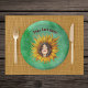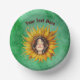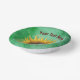 This paper bowl has a smiling girl with brown hair in the middle of a big yellow fancy sunflower on a background in shades of green. Customise your text with the template.