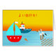 Bon Voyage, Bon Voyage, Carte de voeux papier écrite en japonais. Un coucher de soleil avec voilier, remorqueur, poisson, vagues et pélicans sur la jetée. Envoyez-les au coucher du soleil avec cette carte lumineuse et amusante. Vierge à l'intérieur pour votre message personnel. Art, image et verse © Shoaff Ballanger Studios.