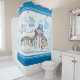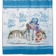 Voici un joyeux rideau de douche bleu avec un mignon bonhomme de neige de vacances et son copain - un chiot en costume Père Noël - tous deux devant une palissade décorée, profitant de la neige.