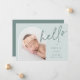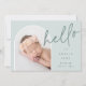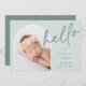 Design élégant de faire-part de naissance photo avec une mise en page unique, cette carte chic dispose d'une photo verticale en forme d'arc sur un arrière - plan vert sage doux, avec "bonjour" superposé dans la typographie de script lettré à la main. Personnalisez avec le nom, la date de naissance et les statistiques de naissance de votre nouveau bébé, et ajoutez un message personnel au dos, ainsi que trois photos carrés supplémentaires.