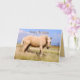 Un beau cheval de palomino se dresse dans un pâturage balayé par le vent. Une autre vue sur le cheval est au dos de la carte.