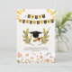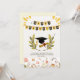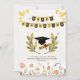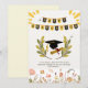 Il s'agit d'un design vertical de carte de voeux avec un arrière - plan blanc propre. En haut, des éléments de décoration ressemblent à des drapeaux en papier ou des bannières. La bannière supérieure affiche "HEUREUX" sur les drapeaux noirs en lettres beiges, et la bannière inférieure indique "GRADUATION" sur les drapeaux beiges en lettres noires. Il y a aussi des formes jaunes et abstraites dans les coins supérieurs qui ressemblent à des confettis ou des rayons du soleil. La partie centrale de la carte présente une illustration détaillée d'un chapeau de graduation noir avec un moule doré, centré entre deux branches d'olivier ou de laurier. Sous cette illustration principale, il y a une citation simple et élégante dans une police serif qui dit : "Un nouveau chapitre, un bon début. Le monde attend avec impatience de voir comment vous le changerez pour le meilleur." Le bas de la carte est décoré d'une bordure de fleurs délicates, de style aquarelle et de feuilles dans les tons rose, orange et vert. L'ensemble est festif, sophistiqué et donne un sentiment d'espoir et de réussite.