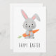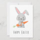 Cette Joyeuse Carte de Fêtes de Pâques présente l'illustration de lapin de Pâques mignon tenant une grande carotte. Le design se décline en gris et en couleurs chaudes : orange, rose et vert. Le dos de la carte contient les restes de la carotte mangée par Bunny. Envoyez cette carte à vos amis et à vos proches pour célébrer les belles vacances de printemps - Pâques.