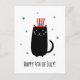 Joyeuse carte du 4 juillet avec un chat noir vêtu d'un casquette patriotique avec étoiles et rayures. Le chat est entouré d'étoiles bleues. Texte : 4 juillet heureux !