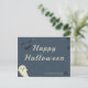 Carte postale Happy Halloween avec un arrière - plan bleu minuit et des textes personnalisables. Elle est accompagnée d'un fantôme, de chauves-souris, d'une araignée, d'un chat noir et de pois blancs et oranges. Parfait pour envoyer à vos amis, à votre famille ou même à vos clients pour Halloween !