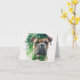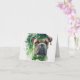 Bonne carte St. Patrick's Day avec un chien portant un chapeau haut et une cravate arc-en-ciel. C'est une carte de voeux pliée. L'intérieur dit : Bonne Saint Patrick.