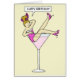 Une dame de bande dessinée, assise dans un grand verre à cocktail, portant le rose et disant "Joyeux anniversaire !".