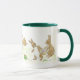 Une tasse blanche avec une poignée et une lèvre vert foncé avec un design de lapins de Pâques cachant les oeufs de Pâques, d'un dessin peint à la main par Judy Adamson.