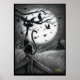 Un chaton éffrayant et mignon qui vit dans un monde noir et blanc se dresse sur un poteau de clôture, sur un décor menaçant d'oiseaux et d'une lune de moisson géante. Extrait du sketchbook de concours d'art encres d'octobre 2020 d'Amanda Diehl, Paxdomino Designs.