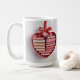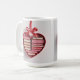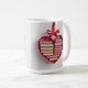 This mug features a red heart-shaped gift box with a red satin ribbon bow at the top. The heart-shaped shelf contains a collection of books that are uniform in size and thickness, creating a layered effect within the heart shape. The heart is on a white background. The books are hardcover editions. The heart gift box has neat, smooth edges and a glossy finish. The red satin ribbon is perfectly tied into a symmetrical bow. The composition has a romantic, Valentine's Day aesthetic with red tones and heart shape. The mug is a classic white mug. The mug is a fifteen ounce mug. The mug is microwave and dishwasher safe.