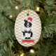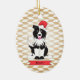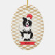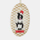 Adorable, noir/blanc Bordure Collie dessin graphique en couleur portant un casquette du Père Noël rouge/blanc, et a la langue rose dehors. Bannière rouge/noir en dessous pour ajouter un nom de familier personnalisé à. Arrière - plan de motif géométrique or/blanc. Graphique par : Lori@SaltTownStudio