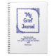 Ecrire dans un journal de deuil est une façon réconfortante de traiter le deuil. Une bordure bleu foncé ornée de fleurs dans deux coins entoure le titre, "My Grief Journal". La citation, "Donnez des mots de tristesse; le chagrin qui ne parle pas tricote le coeur forgé o’er et l’annonce briser", par William Shakespeare est affichée sous le titre. La citation est un rappel que écrire sur votre deuil peut être un moyen vraiment utile de traiter votre deuil. Vous pouvez customiser le titre avec votre propre titre et un devis si vous le souhaitez. Une feuille d'autocollants assortie de devis supplémentaires est disponible.