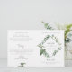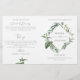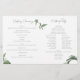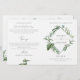 Programme de célébration mariage avec feuilles botaniques verdoyants délicats, géométrie or et texte calligraphie.