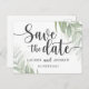 Simple et élégant enregistrer la carte postale date. Doté d'une calligraphie minimaliste de style manuscrit et d'un feuillage tropical en vert. Facile à customiser avec vos informations uniques.