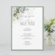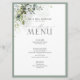 Un cadre de réception parfait avec ce menu branché de 6,5 x 8,75 pouces, avec un bouquet floral de bleu poussiéreux, vert sauge et une végétation botanique d'eucalyptus, bordé d'un vert gris doux. Personnalisez vos détails accentués avec une belle calligraphie moderne lettrée à la main en noir doux. Parfait pour, mais pas limité à, ce mariage de jardin et de jardin. Fait partie d'un ensemble correspondant. Voir la collection complète ici : https://www.zazzle.com/collections/elegant_botanical_greenery_floral_watercolor_suite-119826569235577486 Contacter le concepteur pour les produits correspondants. Copyright Invitations élégants, tous droits réservés.