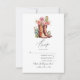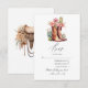 Capturez le charme d'un mariage sur le thème western avec cette carte de réponse RSVP magnifiquement conçue. Le devant présente des bottes de cowboy florales à l'aquarelle avec des cactus, tandis que le verso présente une illustration élégante de selle florale. Parfait pour les mariages rustiques, bohémiens ou champêtres, cette carte de réponse permet à vos invités de répondre avec style. Personnalisez avec vos détails de mariage pour une suite de papeterie cohérente et unique.