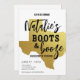Réalisez les rêves de Texas Bachelorette de cette charmante demoiselle avec cette invitation Boots & Booze Texas Bachelorette. Mettez l'accent sur la dame chanceuse avec son design glamour noir et or et la carte dorée du Texas, prête à faire la fête et à s'amuser !