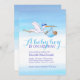 Joli invitation baby shower, avec la peinture à l'aquarelle mignonne d'une cigogne lunatique livrant un nouveau bébé garçon. Invitations Whimsical nouveau bébé garçon bébé douche bébé. Personnalisez avec vos détails de baby shower. © Uniquement peint en aquarelle et dessiné par Sarah Trett.