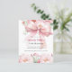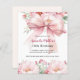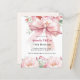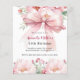 Un arrière - plan blanc, décoré d'un grand arc rose et de fleurs roses. Personnalisez et ajoutez un nom et des détails du parti. Retour : pêche, arrière - plan couleur crème. 1 feuille = 1 invite imprimé bord à bord.