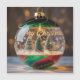 Une photographie détaillée et en gros plan d'une élégante boule de Noël en verre conçue pour ressembler à un mini-globe neigeux. À l'intérieur du globe transparent, trois mini-sapins de Noël en pinceau sont nichés dans de la fausse neige blanche. L'extérieur en verre présente des volutes décoratives de peinture rouge foncé et vert émeraude, et les mots "Joyeux Noël" sont écrits en police cursive blanche sur le devant, ainsi que de petits flocons de neige. L'arrière-plan est flou avec des lumières dorées et chaudes en bokeh, créant une atmosphère douce, magique et festive.